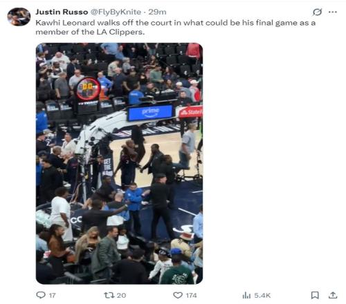 比賽結(jié)束后,倫納德跟勇士球員握手致意,隨后他沒有停留直接進入了更衣室,快船記者Justin Russo寫道:倫納德直接離開球場,這或許他快船生涯的最后一場比賽。