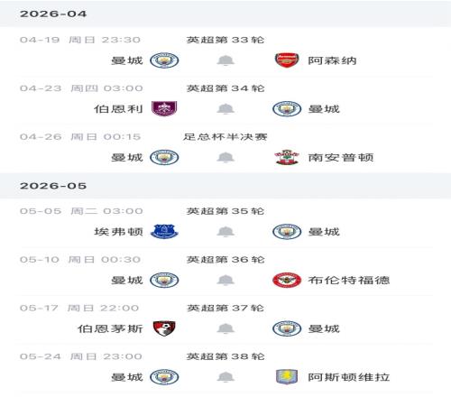 曼城賽程: