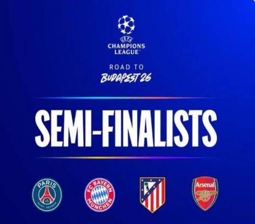 歐冠半決賽對(duì)陣已出爐,四支球隊(duì)分別來自法甲、德甲、西甲和英超,巴黎圣日耳曼將對(duì)陣拜仁慕尼黑,馬德里競技將對(duì)陣阿森納。