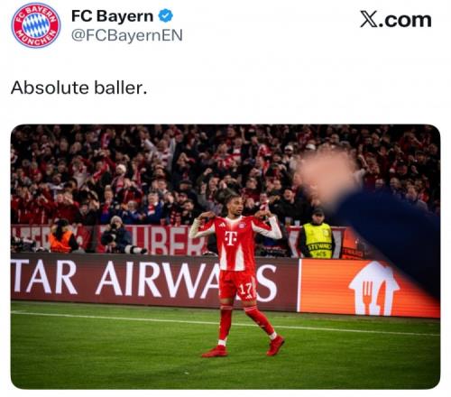 拜仁官推賽后曬出了奧利塞向球迷展示球衣的慶祝照,并配文寫道:絕對(duì)球星級(jí)表現(xiàn)。