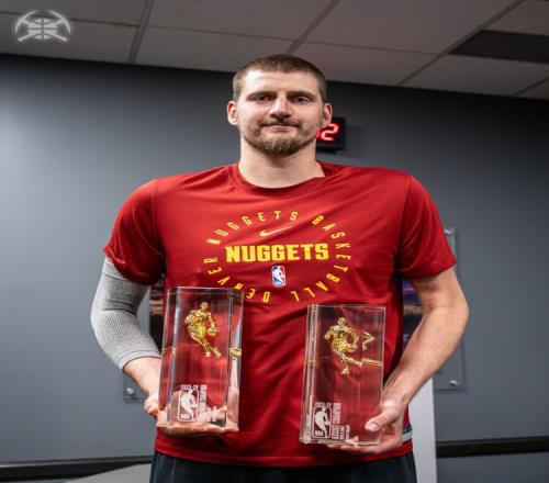 大王的雙王!掘金曬約基奇領(lǐng)取助攻王&籃板王獎(jiǎng)杯照片