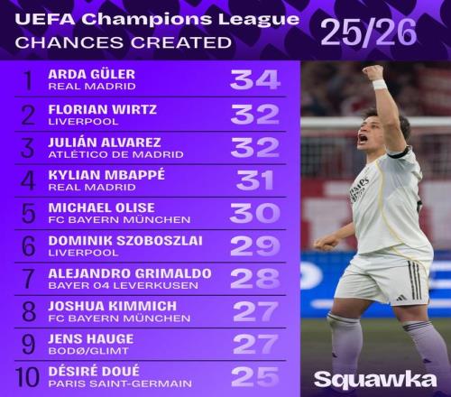 數(shù)據(jù)機(jī)構(gòu)Squawka列出本賽季歐冠截至目前創(chuàng)造機(jī)會(huì)榜,居萊爾34次居首,維爾茨、阿爾瓦雷斯32次并列第二。