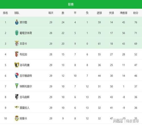 讓我們看看葡萄牙超級聯(lián)賽,目前已經(jīng)來到第29輪,領頭羊?qū)儆诓枅D,已經(jīng)得到76分,緊隨其后的是葡萄牙體育,少賽一場有71分,落后榜首5分,第三名是本菲卡,至今仍保持不敗金身,但是平局過多,只有69分,第四名的布拉加就落后榜首三強不少,只有52分。