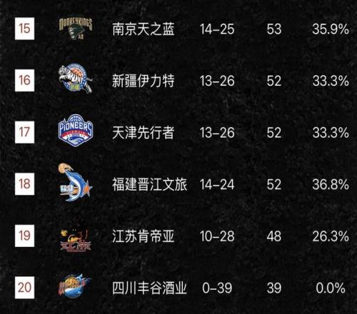 廣州隊第十三名,目前就是廣州隊和北控隊來爭奪最后一個進入季后賽的名額,兩支球隊都有可能最后時刻敲定季后賽的席位,吉林隊排在第十四名,南京隊排在了第十五名,新疆隊排在第十六名,天津隊排在第十七名,福建隊排在第十八名,江蘇隊排在第十九名,四川隊本賽季未嘗一勝排在第二十名的位置!