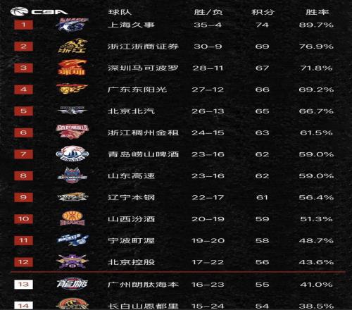 CBA前39輪全部完賽,上海20連勝穩(wěn)居第一,廣東穩(wěn)住第四,遼寧第九山西第十