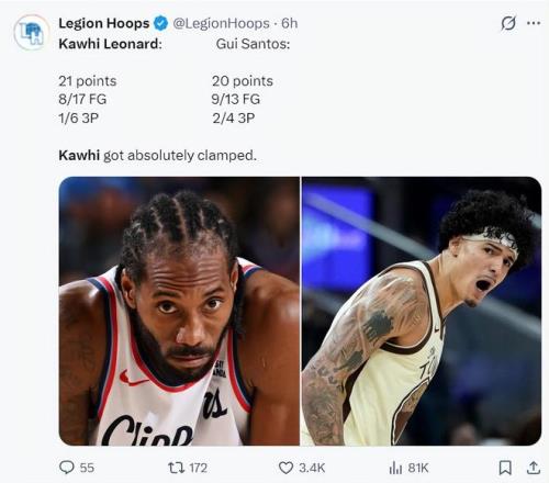 美媒LH還曬出倫納德與桑托斯的數(shù)據(jù)對(duì)比,倫納德40分鐘,17中8+三分6中1拿到21分7籃板3助攻5失誤;桑托斯32分鐘,13中9+三分4中2拿到20分6籃板5助攻1搶斷,很明顯桑托斯的數(shù)據(jù)比倫納德還好。