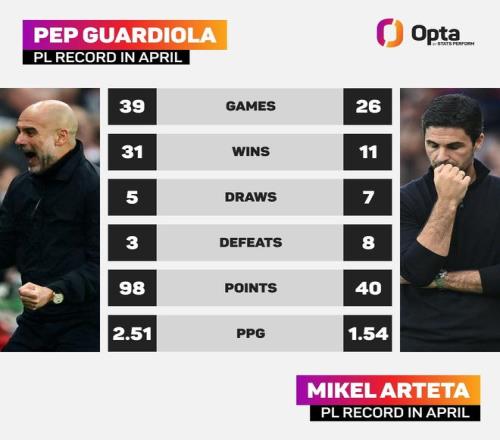 差距明顯,瓜帥4月份英超場均拿2.51分,阿爾特塔場均1.54分
