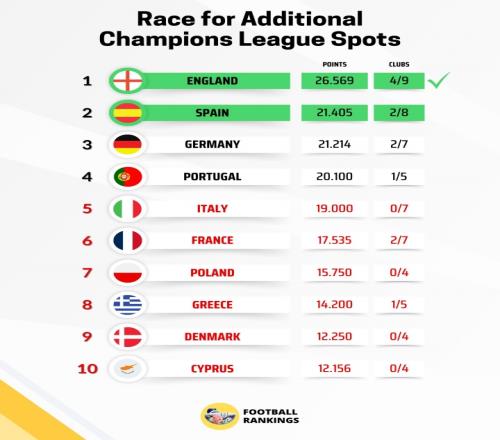 激烈!歐戰(zhàn)積分排名:英超繼續(xù)領(lǐng)跑,西甲只領(lǐng)先德甲0.191分