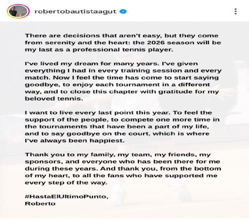 前TOP10包蒂斯塔·阿古特在社交媒體表示,征戰(zhàn)職業(yè)網(wǎng)壇20年后,他將在本賽季結(jié)束后為自己的巡回賽生涯畫上句號。