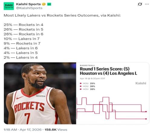 此前ESPN的12位專家一致認(rèn)為這組首輪對(duì)決是火箭晉級(jí),根據(jù)數(shù)據(jù)美媒Kalshi Sports寫道,火箭4場(chǎng)晉級(jí)概率25%、火箭5場(chǎng)晉級(jí)概率26%、火箭6場(chǎng)晉級(jí)概率26%、火箭7場(chǎng)晉級(jí)概率9%。換言之火箭橫掃湖人的概率比湖人所有的晉級(jí)概率加起來都高。
