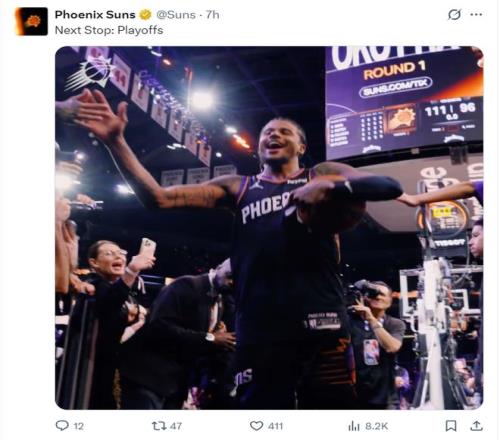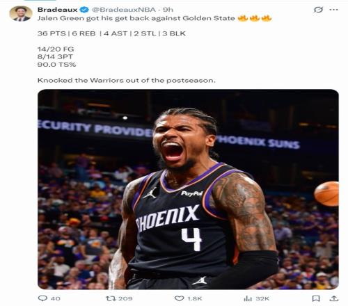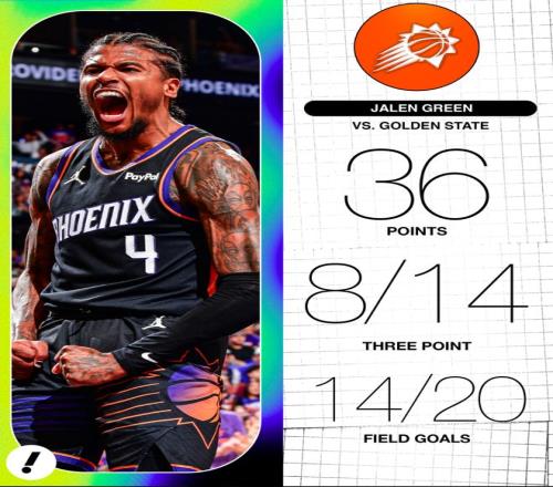 賽后杰倫-格林在主場受到了鳳凰城球迷的歡呼/吶喊,他附加賽G1拿到35分2個三分球,附加賽兩場比賽格林合計拿到71分+10個三分球,場均35.5分5.5板1.0斷2.0帽,命中率57%,三分球命中率47%。