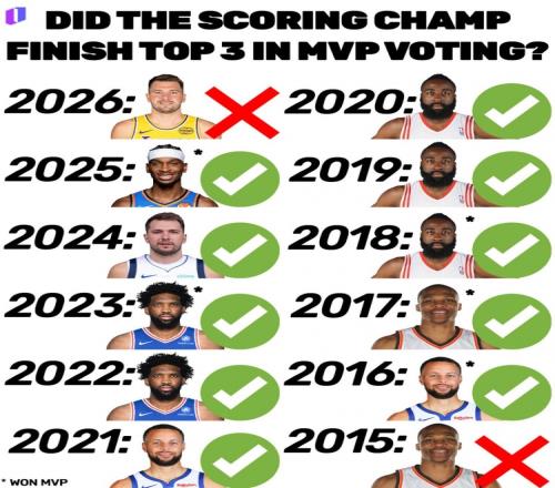 據(jù)統(tǒng)計(jì),東契奇是自2015年的威斯布魯克以來,首位無緣賽季MVP前三的聯(lián)盟得分王。