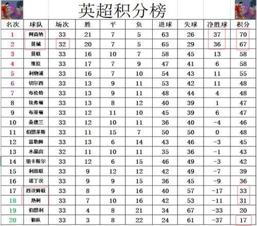 積分榜方面,阿森納昨天輸了爭(zhēng)冠關(guān)鍵戰(zhàn),現(xiàn)在他們和曼城的冠軍爭(zhēng)奪進(jìn)入白熱化階段,兩隊(duì)最后很大可能將由凈勝球決出誰(shuí)是冠軍。保級(jí)同樣激烈,西漢姆聯(lián)今天搶到了關(guān)鍵的1分,目前熱刺少西漢姆聯(lián)2分仍陷在降級(jí)區(qū),保級(jí)形勢(shì)堪憂。隨著西漢姆聯(lián)拿到1分,墊底的狼隊(duì)落后西漢姆聯(lián)16分,成為本賽季英超首支降級(jí)球隊(duì)。