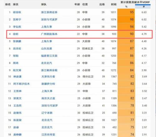 徐昕在離開杜鋒租借加盟廣州男籃后,打出了全明星級別的表現。本賽季徐昕場均出戰(zhàn)24.6分鐘,能夠得到11分8.4籃板1.9蓋帽,籃板本土第二,蓋帽則是本土第一。徐昕的出色表現在高階數據上也能體現,在MVP的最重要的參考數據(累計獲勝貢獻水平)上,徐昕高達4.79,位列聯盟第四。