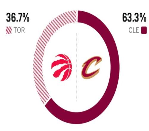 賽前,美媒ESPN對(duì)本場(chǎng)比賽進(jìn)行了勝率預(yù)測(cè),騎士隊(duì)勝率高達(dá)63.7% ,猛龍勝率則僅有36.3% ,差距更加明顯。