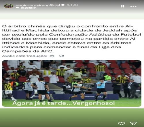 體育播報04月21日宣 吉達(dá)聯(lián)合主帥孔塞桑在個人INS轉(zhuǎn)發(fā)馬寧因誤判被亞足聯(lián)內(nèi)部處罰的消息,并配上吐槽:“現(xiàn)在為時已晚……真丟人!”