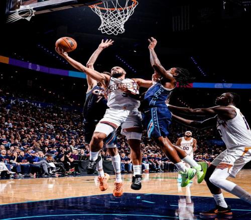 亞歷山大被封蓋,伊戈達(dá)羅上籃不中,亞歷山大單打狄龍中距離取分。布克上籃得手,戴格諾特請(qǐng)求暫停?;裟犯駛惐成韱未蛉》?,格林2罰全中,亞歷山大上籃打進(jìn),狄龍進(jìn)攻犯規(guī),霍姆格倫轟進(jìn)3分球。