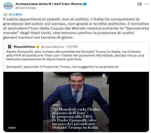 伊朗駐意大利羅馬大使館隨即在社交媒體發(fā)文回應(yīng):“足球?qū)儆谌嗣瘢钦?。意大利的足球輝煌是在賽場上拼來的,絕非仰仗政治紅利。企圖剝奪伊朗的世界杯參賽資格,恰恰暴露了美國的‘道德破產(chǎn)’——他們甚至連十一名伊朗年輕球員現(xiàn)身賽場都心懷忌憚?!?/p>