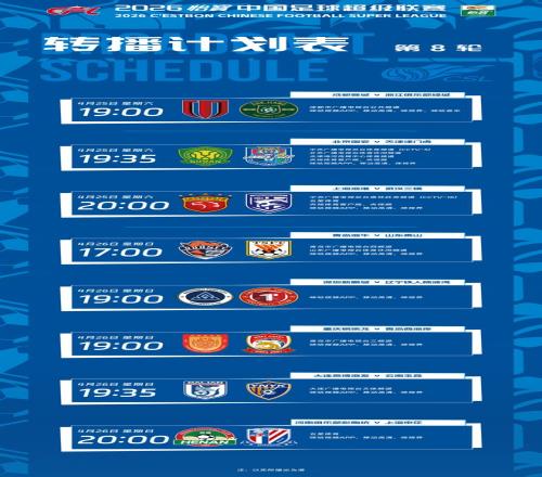 一周雙賽,緊鑼密鼓!4月25日、26日,2026賽季中超聯(lián)賽將展開第8輪較量。根據(jù)轉(zhuǎn)播計(jì)劃,本輪8場(chǎng)比賽都有網(wǎng)絡(luò)直播,7場(chǎng)還有電視平臺(tái)直播。央視體育頻道(CCTV5)、奧林匹克頻道(CCTV16)也將直播2場(chǎng)。