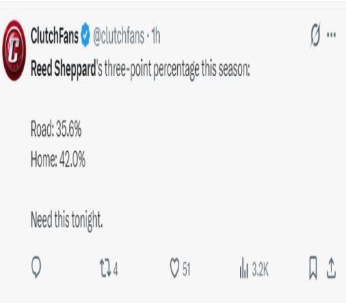 賽前休媒曬出謝潑德在主場三分命中率42%,賽季只有35.6%,他認為謝潑德會迎來爆發(fā)。