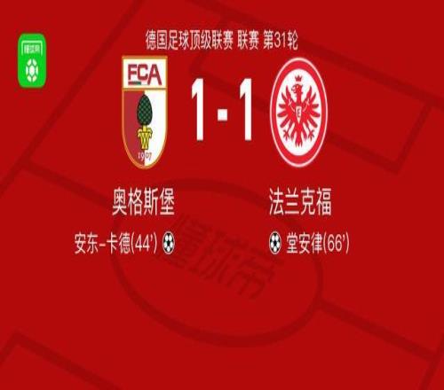 北京時間4月25日德國足球頂級聯(lián)賽 聯(lián)賽 第31輪,奧格斯堡主場對陣法蘭克福。奧格斯堡安東-卡德破門。法蘭克福堂安律破門。最終比分奧格斯堡 1-1 法蘭克福。