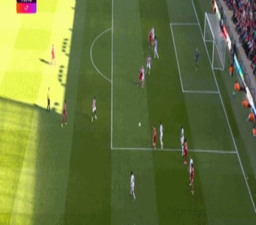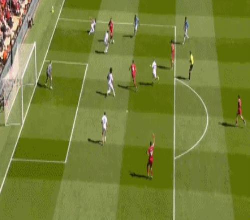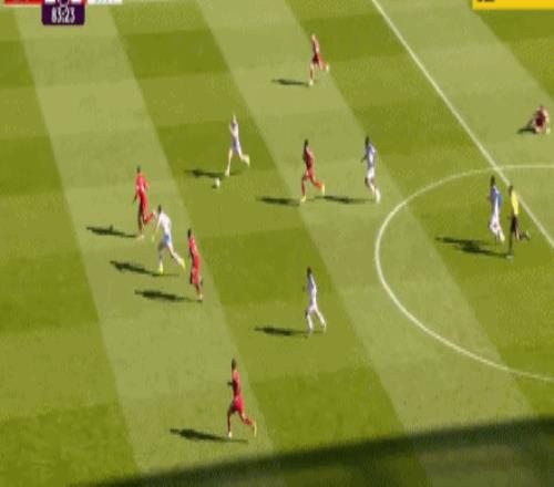 第11分鐘,拉克魯瓦右路回傳,沃頓禁區(qū)前沿45°傳中,理查茲插上頭槌攻門,沒能頂在球門范圍內,利物浦逃過一劫。