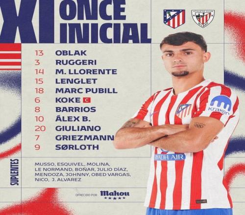 馬競首發(fā):13-奧布拉克、3-魯杰里、14-馬科斯-略倫特、15-朗格萊、18-馬克-普維爾、6-科克、8-巴勃羅-巴里奧斯、10-巴埃納、20-朱利亞諾-西蒙尼、7-格列茲曼、9-瑟洛特