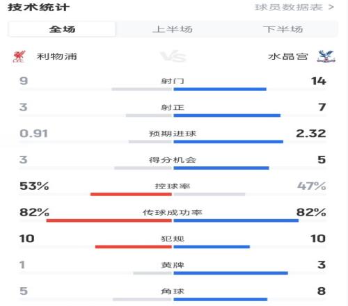 利物浦31水晶宮全場(chǎng)數(shù)據(jù):射門914,射正37,控球率53%47%