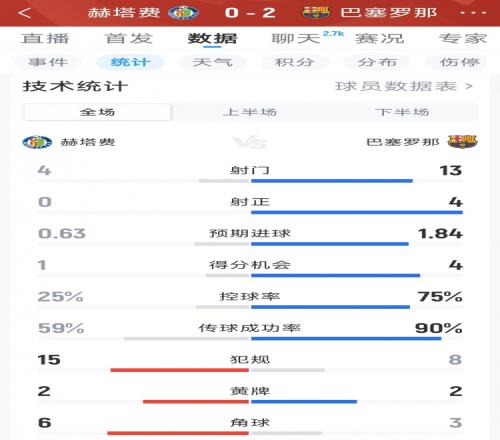 巴薩20赫塔費(fèi)全場(chǎng)數(shù)據(jù):射門134,射正40,得分機(jī)會(huì)41