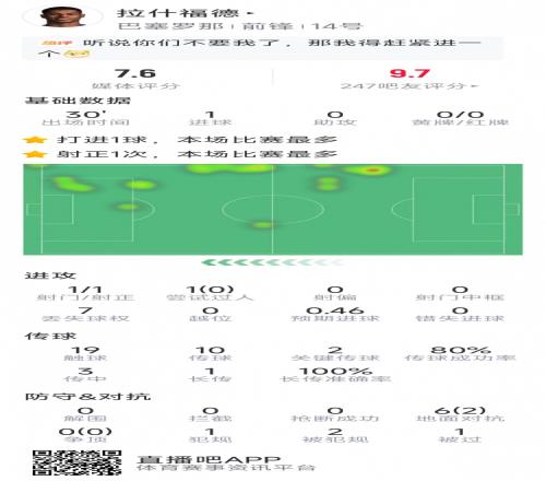 體育播報4月26日宣 在本輪西甲,巴薩2-0擊敗赫塔費,拉什福德替補(bǔ)破門,以下為他在本場數(shù)據(jù):