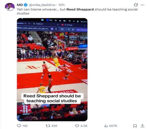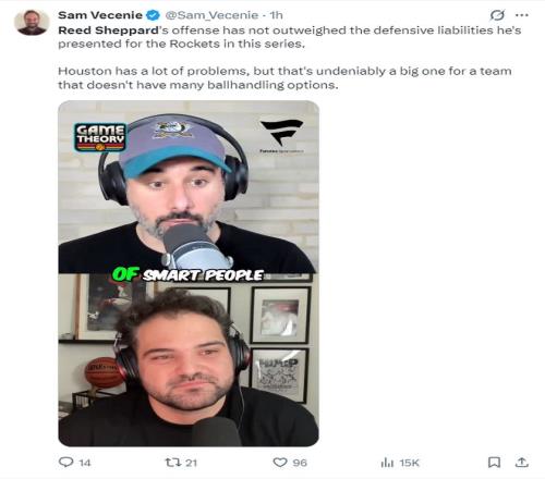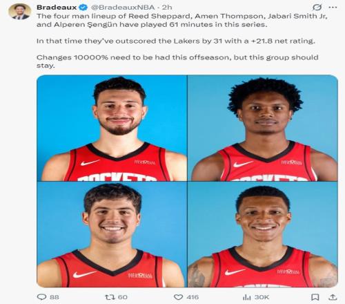 盡管謝潑德這輪系列賽命中率26.7%,但休媒Bradeaux寫道:謝潑德、阿門、小賈、申京合計在場61分鐘,這段時間里他們比湖人多得31分,凈效率+21.8分,休賽期火箭肯定需要做出改變,但這四人我覺得應該留下。(休媒覺得謝潑德還是該繼續(xù)留用)