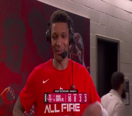體育播報4月27日宣 在今天結(jié)束的一場季后賽中,火箭以115-96戰(zhàn)勝湖人。賽后,火箭球員小賈巴里·史密斯接受了媒體的采訪。以下是完整版采訪內(nèi)容。