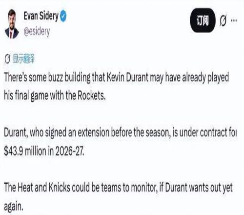 就在系列賽膠著之際,名記Evan Sidery于4月27日爆料,杜蘭特很可能已打完在火箭的最后一場比賽。這位37歲的超級得分手,與球隊尚余兩年、總額9000萬美元的合同,下賽季薪資高達4390萬美元。盡管年齡增長,他的得分能力、關(guān)鍵球處理和季后賽經(jīng)驗,仍使其成為聯(lián)盟最具交易價值的老將之一。