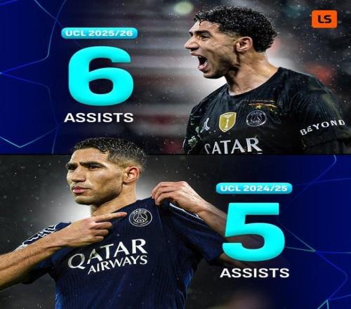 新成就,阿什拉夫成歐冠歷史首位連續(xù)兩個賽季助攻5+的后衛(wèi)