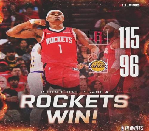 G1沒有杜蘭特,火箭98-107湖人;G2有杜蘭特,火箭94-101湖人;G3沒有杜蘭特,火箭108-112湖人;G4沒有杜蘭特,火箭115-96大勝湖人。