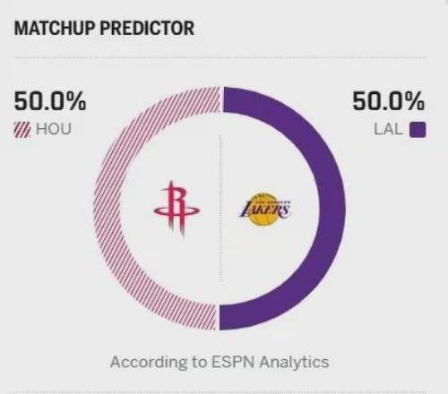 知名美媒ESPN預(yù)測(cè)了湖人和火箭在G5的勝率,都是50%,如下:
