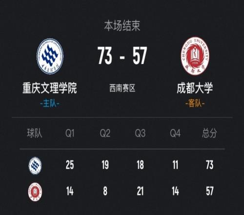 末節(jié)決戰(zhàn),雙方開始有意輪換練兵,陳園里突外投連得5分助成都大學(xué)追到14分,但木乃布合強(qiáng)打2+1再次回應(yīng)保持住20分以上領(lǐng)先,最后近4分鐘重慶文理一分未得,但不影響比賽大局,最終重慶文理73-57力克成都大學(xué)。