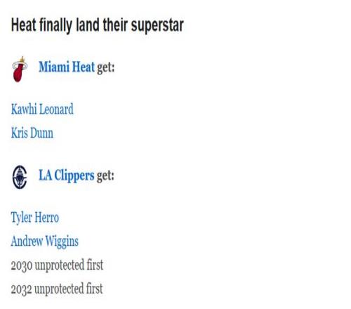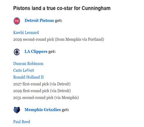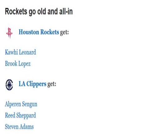 快船得到:鄧肯-羅賓遜、卡里斯-勒維爾、羅納德-霍蘭德二世、2027年活塞首輪簽、2029年活塞首輪簽、2031年灰熊次輪簽
