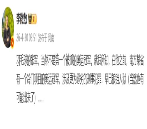 經(jīng)濟(jì)觀察報記者李微敖寫道:“羽毛球的張軍,當(dāng)然不是第一個被抓的奧運冠軍。就我所知,在他之前,南方某省有一個冷門項目的奧運冠軍,涉及更為惡劣的刑事犯罪,早已鋃鐺入獄(當(dāng)然也有可能出來了)…… ???”