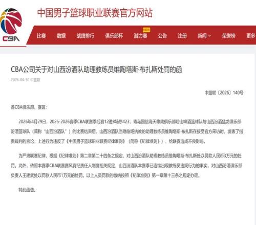 剛剛,CBA公司給山西隊(duì)開出了一份大罰單!對(duì)助理教練陶塔斯·布扎斯l罰款30000元,對(duì)王建武罰款10000元。