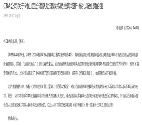 今日,CBA開出了季后賽階段的首張罰單。昨晚青島和山西比賽賽后采訪中,當(dāng)晚臨場(chǎng)執(zhí)教的山西助教維陶塔斯·布扎斯發(fā)表了指責(zé)裁判的言論,由于“上述行為違反了《中國(guó)男子籃球職業(yè)聯(lián)賽紀(jì)律準(zhǔn)則》,給聯(lián)賽造成不良影響”,將對(duì)山西助教維陶塔斯·布扎斯罰款人民幣3萬(wàn)元。另外“依照本賽季CBA聯(lián)賽賽風(fēng)賽紀(jì)責(zé)任人制度相關(guān)規(guī)定,山西汾酒隊(duì)本賽季已連續(xù)出現(xiàn)教練員違規(guī)行為的事實(shí)”,對(duì)山西汾酒俱樂(lè)部負(fù)責(zé)人王建武罰款人民幣1萬(wàn)元。