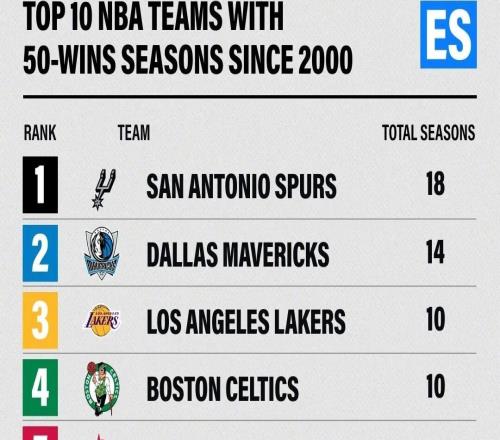 NBA大統(tǒng)計(jì)又來(lái)了!排名前十的都是有底蘊(yùn)的球隊(duì)啊! 2000年至今,各隊(duì)賽季50勝+次數(shù)的排名,馬刺以18個(gè)賽季勝場(chǎng)50+高居榜首,獨(dú)行俠以14次緊跟其后,再往后依次是湖人、凱爾特人、火箭