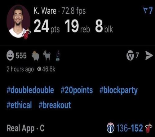熱火新秀Kel'el Ware昨天打奇才,24分19籃板8蓋帽,準(zhǔn)三雙帶蓋帽的數(shù)據(jù)。賽后熱區(qū)Reddit吵翻了——有人翻記錄發(fā)現(xiàn),官方統(tǒng)計和現(xiàn)場播報對蓋帽數(shù)各執(zhí)一詞,7個還是8個成了羅生門。更