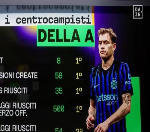 巴雷拉四大數(shù)據(jù)位列意甲中場第一,含8次助攻以及創(chuàng)造59次機(jī)會