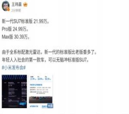 電競體育3月19報道?小米春季新品發(fā)布會,新一代SU7正式登場,其中標(biāo)準(zhǔn)版21.99萬,P...