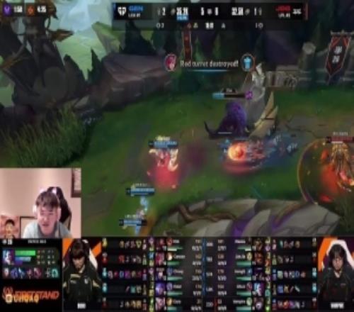 電競(jìng)體育3月17報(bào)道 先鋒賽GEN對(duì)陣JDG,朱開直播看比賽,JDG開局不久拿下三個(gè)擊殺:j...