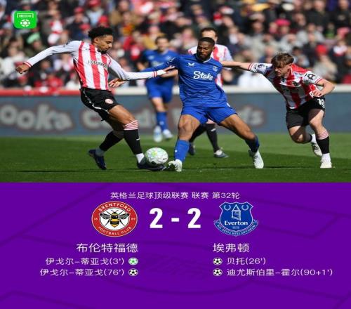 北京時(shí)間4月11日22:00,英超第32輪,布倫特福德主場(chǎng)對(duì)陣埃弗頓。上半場(chǎng),皮克福德鏟倒沙德被判罰點(diǎn)球,伊戈?duì)?蒂亞戈點(diǎn)射命中,布蘭斯韋特遠(yuǎn)射打偏,貝托頭球扳平比分。下半場(chǎng),內(nèi)森-科林斯頭球攻門擊中門框,卡約德射門打在伊戈?duì)?蒂亞戈身上彈進(jìn)球門,霍爾補(bǔ)時(shí)抽射絕平,最終,布倫特福德2-2埃弗頓遭聯(lián)賽4連平。