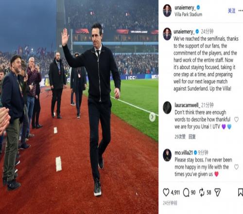 體育播報4月17日宣 阿斯頓維拉在本輪歐聯(lián)杯八強戰(zhàn)兩回合總比分7-1血洗博洛尼亞,主帥埃梅里在賽后通過社媒發(fā)文慶祝。