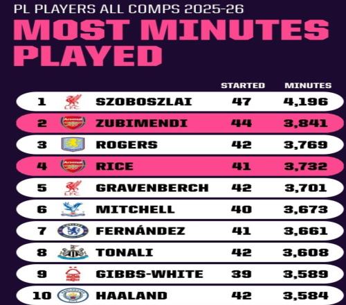體育播報(bào)4月17日宣 OPTA對(duì)英超球員本賽季各項(xiàng)賽事出場(chǎng)時(shí)間進(jìn)行了統(tǒng)計(jì),利物浦的索博斯洛伊以4196分鐘居首,阿森納兩將蘇維門迪和賴斯位居第2和第4位,兩人出場(chǎng)時(shí)間分別為3841分鐘和3732分鐘。