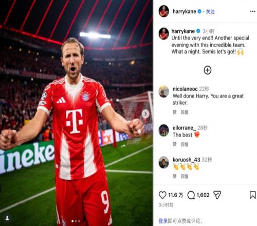今日凱恩更新社媒,曬出多張照片并配文寫道:“直到比賽最后一刻!與這支強(qiáng)力之師一同度過(guò)了一個(gè)特別的夜晚。多么出色的一晚!半決賽沖沖沖!”